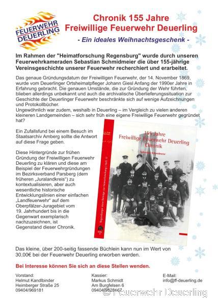 Das kleine, über 200-seitig fassende Büchlein kann im Wert von 30,00€ bei der Vorstandschaft bzw. unter info@ff-deuerling.de erworben werden.